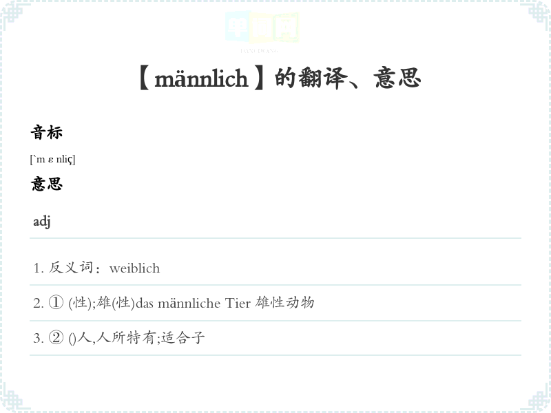 ③ 子气概,雄赳赳,刚强Sie findet Männer mit Bart sehr männlich.她觉得带胡须子特别有子气概。