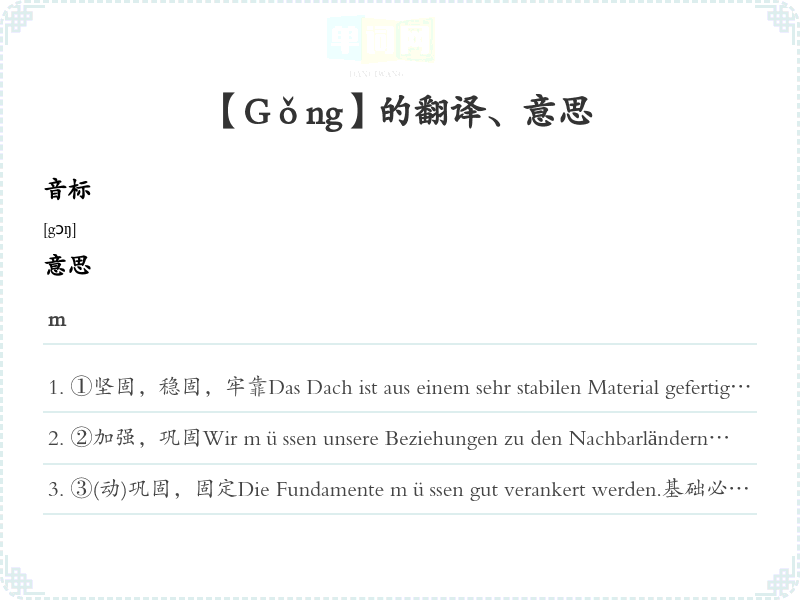 ①坚固,稳固,牢靠Das Dach ist aus einem sehr stabilen Material gefertigt.屋顶是用非常坚固的材料制成的。