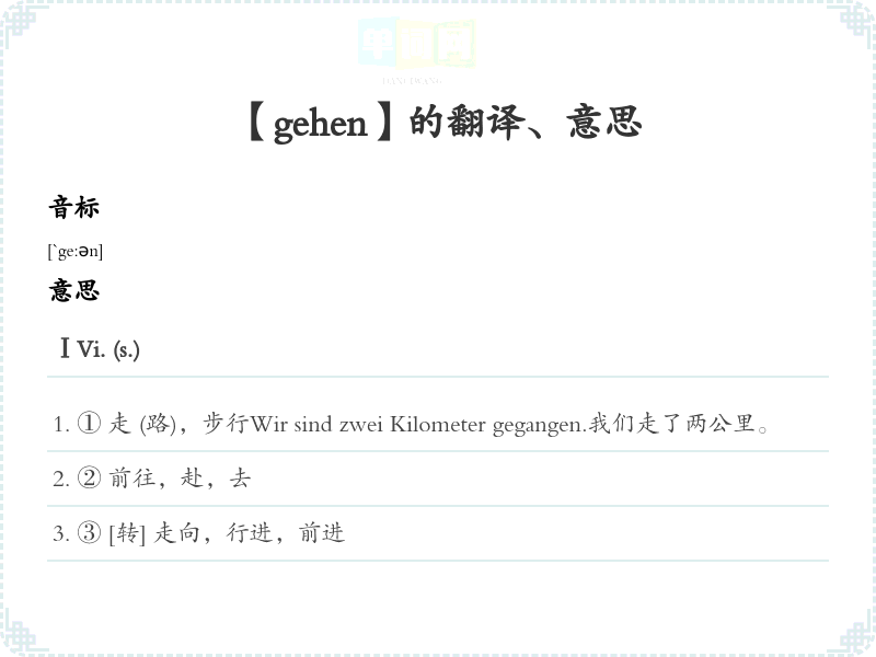 走,行走Ⅲrefl.走得...Ich habe mich müde gegangen.我走得累了。Es geht sich gut in diesen Schuhen.穿这双鞋走起路来很舒服。语法搭配sich+四格, +四格, +三格, über+三格, in+三格, neben+三格, auf+四格, durch+四格, über+四格, von+三格, hinter+三格, an+四格, vor+三格, mit+三格, in+四格, zu+三格, nach+三格, um+四格, gegen+四格, an+三格, +als, +wie