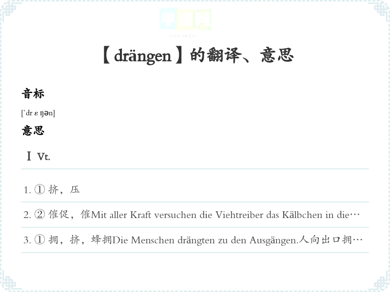 ② 渴望,力求,力争Ⅳdrängend P.Ⅰ 紧迫,迫切gedrängt P.Ⅱ 紧密,密集,简练语法搭配sich+四格, +四格, in+四格, zu+三格, auf+四格, um+四格, gegen+四格