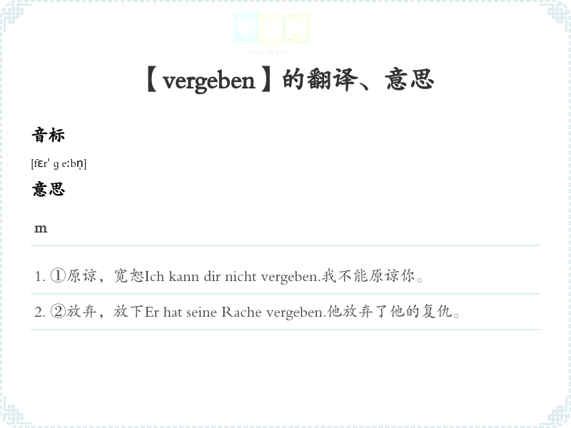 ②放弃,放下Er hat seine Rache vergeben.他放弃了他的复仇。