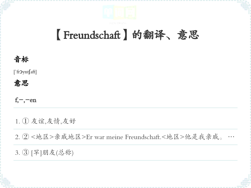 ② <地区>亲戚地区>Er war meine Freundschaft.<地区>他是我亲戚。 地区>