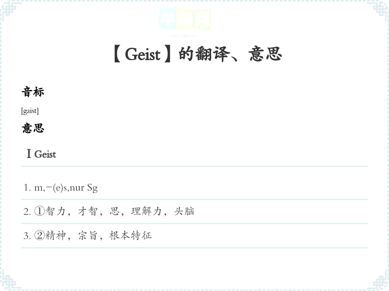②亡灵,幽灵,灵魂In dem alten Schloss geht nachts der Geist eines Ritters um.夜,在那座古老的宫殿骑士显灵。