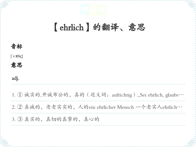 ① 诚实的,开诚布公的,真的(近义词:aufrichtig),,Sei ehrlich, glaubst du das?" - ,,Ehrlich gesagt, nein"真的,你信这个?——说实话,我信。Ich muss ehrlich sagen, ... 我必须坦白地说…