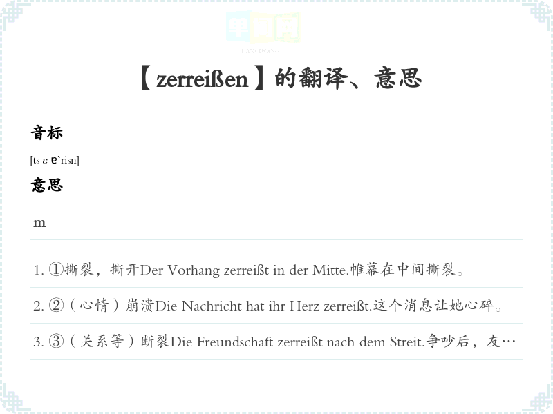 ①撕裂,撕开Der Vorhang zerreißt in der Mitte.帷幕在中间撕裂。