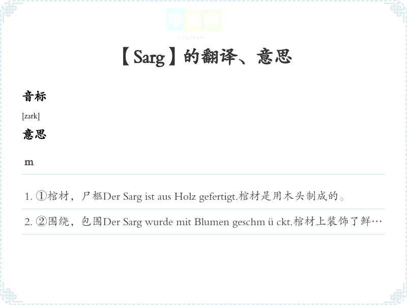 ①棺材,尸柩Der Sarg ist aus Holz gefertigt.棺材是用木头制成的。