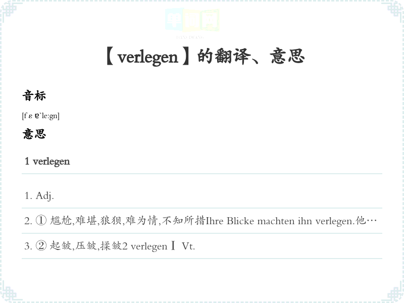 ⑦ <地区>借给,垫付 地区>Ⅱ Vr.转而尝试(其他办法),转而从事Als seine Überredungskünste nicht wirkten, verlegte er sich aufs Bitten.当他技巧没用,他转而尝试请求.语法搭配sich+四格, +四格, +三格, auf+四格, nach+三格, um+四格