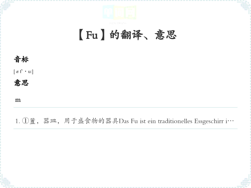 ①簠,器皿,用于盛食物的器具Das Fu ist ein traditionelles Essgeschirr in der chinesischen Kultur.簠是中国文化中的一种传统餐具。