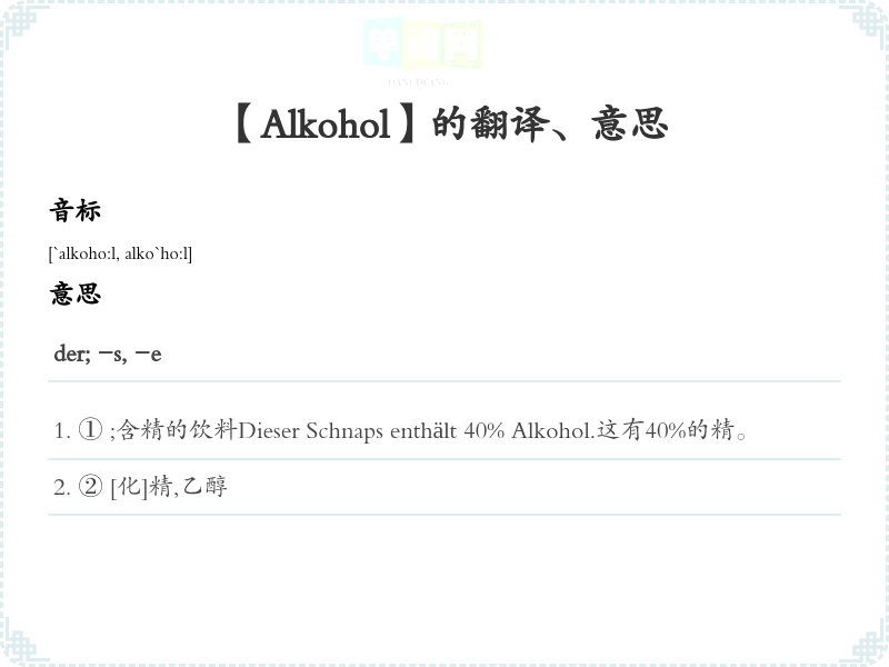 ① ;含精的饮料Dieser Schnaps enthält 40% Alkohol.这有40%的精。