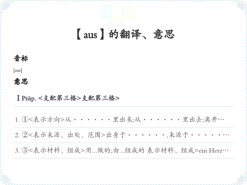 ①<表示方向>从······里出来;从······里出去;离开······表示方向>Er ist aus Berlin gekommen.他从柏林来。