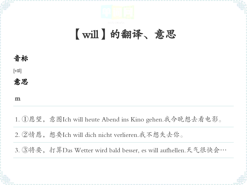 ①愿望,意图Ich will heute Abend ins Kino gehen.我今晚想去看电影。