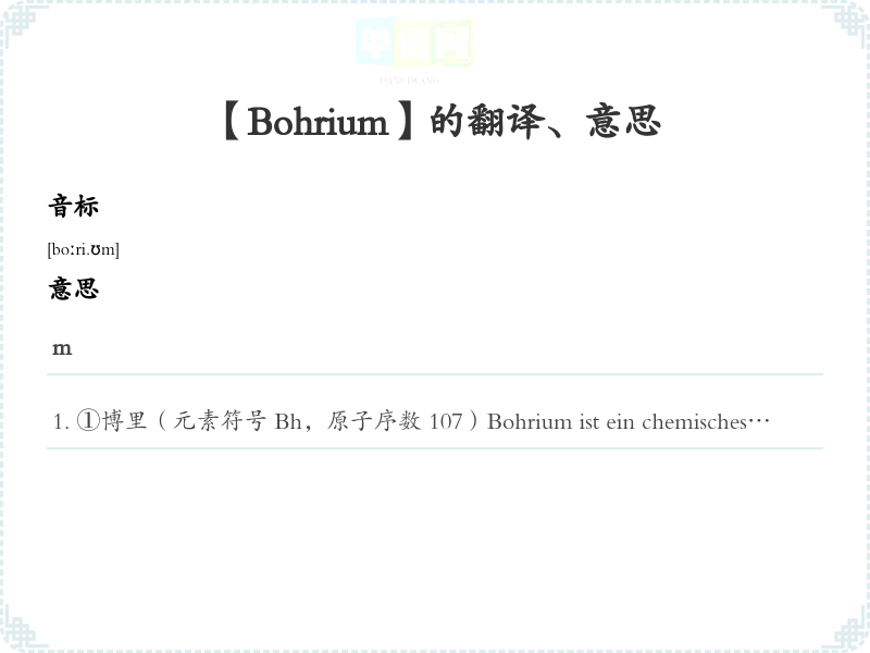 ①博里(元素符号 Bh,原子序数 107)Bohrium ist ein chemisches Element mit dem Symbol Bh und der Ordnungszahl 107.