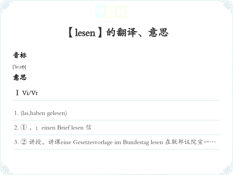 ② 拣选;剔出;拣出Salat lesen 剔除生菜的坏叶语法搭配sich+四格, +四格, über+四格, von+三格, für+四格, +als, +wie