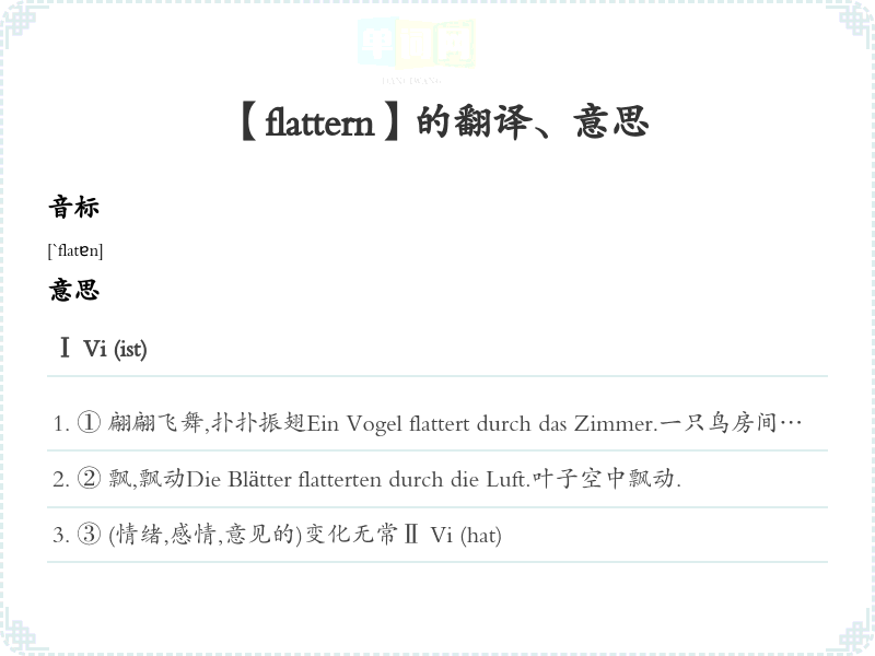 ② 飘,飘动Die Blätter flatterten durch die Luft.叶子空中飘动.
