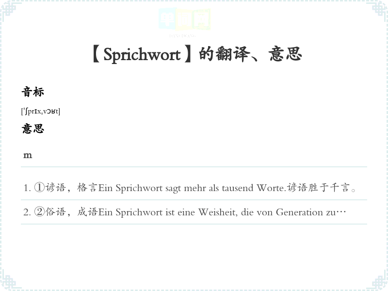 ①谚语,格言Ein Sprichwort sagt mehr als tausend Worte.谚语胜于千言。