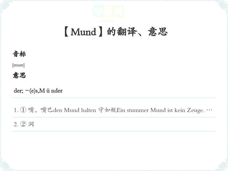 ① 嘴,嘴巴den Mund halten 守如瓶Ein stummer Mund ist kein Zeuge. 死人不作证。