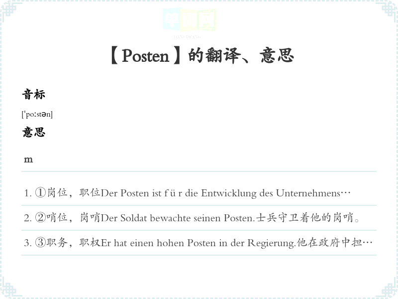 ①岗位,职位Der Posten ist für die Entwicklung des Unternehmens wichtig.该岗位对公司的发展至关重要。