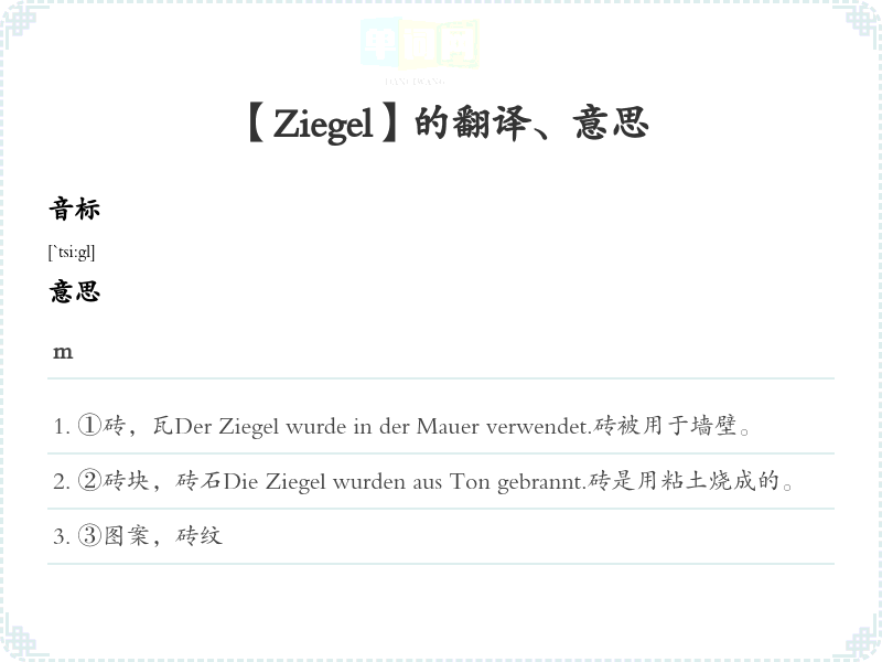 ②砖块,砖石Die Ziegel wurden aus Ton gebrannt.砖是用粘土烧成的。