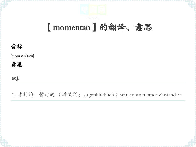 片刻的,暂时的 (近义词:augenblicklich)Sein momentaner Zustand / Die momentane Lage ist beunruhigend.他目前状况/这眼前形式令人不安。Ich kann mich momentan nicht erinnern.我一下子回忆不起来了。