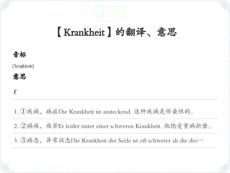 ①疾病,病症Die Krankheit ist ansteckend. 这种疾病是传染性的。