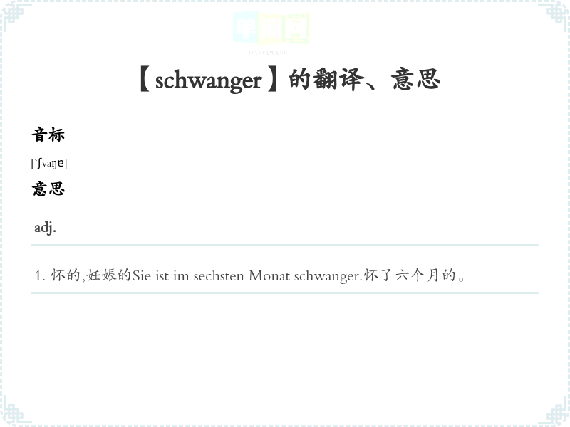怀的,妊娠的Sie ist im sechsten Monat schwanger.怀了六个月的。
