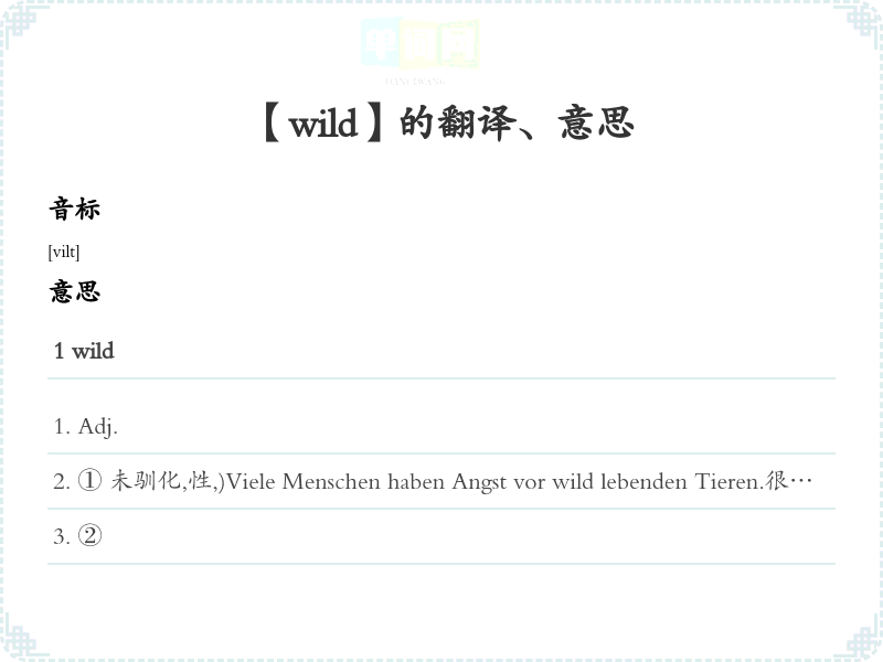 ① 未驯化,性,)Viele Menschen haben Angst vor wild lebenden Tieren.很多人害怕未驯化动物。
