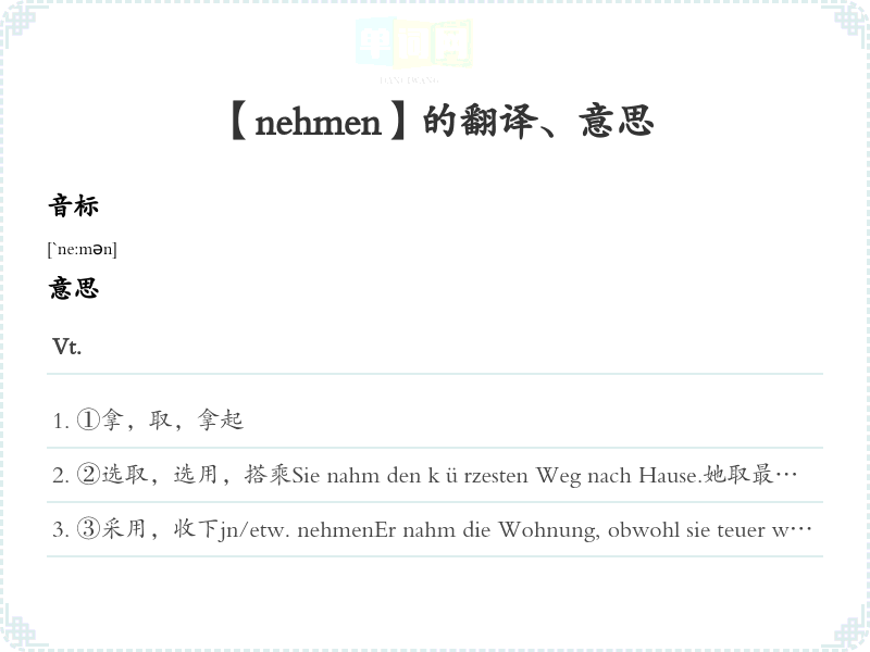 ②选取,选用,搭乘Sie nahm den kürzesten Weg nach Hause.她取最短的路回家。