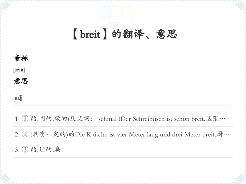 ④ 广的,广泛的breite Masse 广泛的群众基础Der Appell fand ein breites Echo in der Bevölkerung.这次号召得到了广泛的响应。