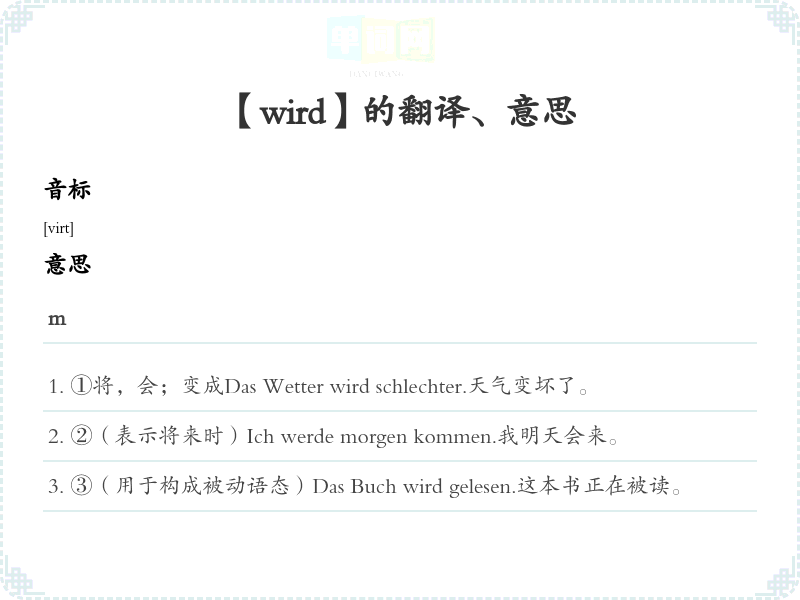 ③(用于构成被动语态)Das Buch wird gelesen.这本书正在被读。