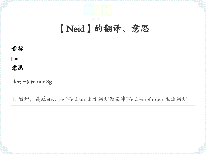 嫉妒,羡慕etw. aus Neid tun出于嫉妒做某事Neid empfinden 生出嫉妒心Er platzte fast vor Neid, als sie mit dem neuen Auto vorfuhr.当她驾着新,他嫉妒得炸了。vor Neid grün werden / erblassen 嫉妒得脸色发青/发白