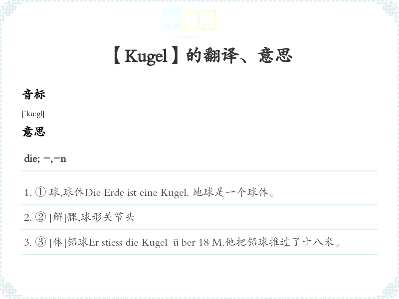① 球,球体Die Erde ist eine Kugel. 地球是一个球体。