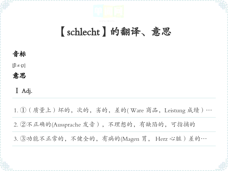 ⑪ 普普通通的,朴素的,简单的,Ⅱ Adv.很难,几乎不能,好不容易Ich kann ihn doch schlecht darum bitten.为这事儿求他我真是感到为难。Das ist schlecht möglich.这不大可能。