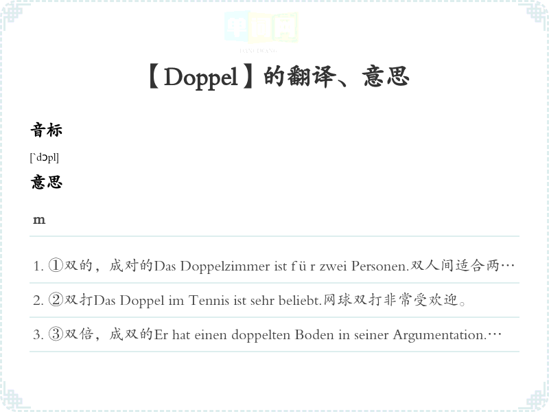 ①双的,成对的Das Doppelzimmer ist für zwei Personen.双人间适合两人入住。