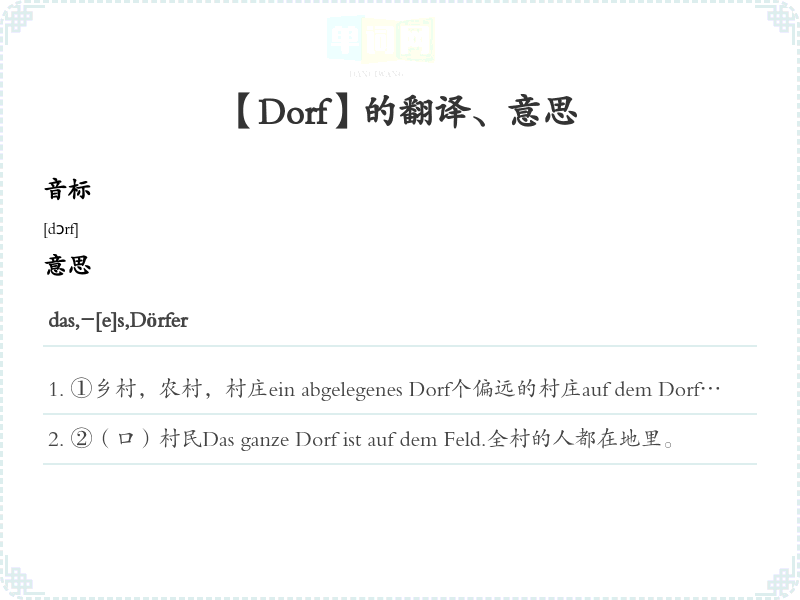 ①乡村,农村,村庄ein abgelegenes Dorf个偏远的村庄auf dem Dorf wohnen住在农村