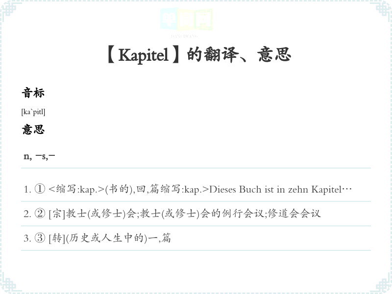① <缩写:kap.>(书的),回,篇缩写:kap.>Dieses Buch ist in zehn Kapitel eingeteilt.这本书被分为10。