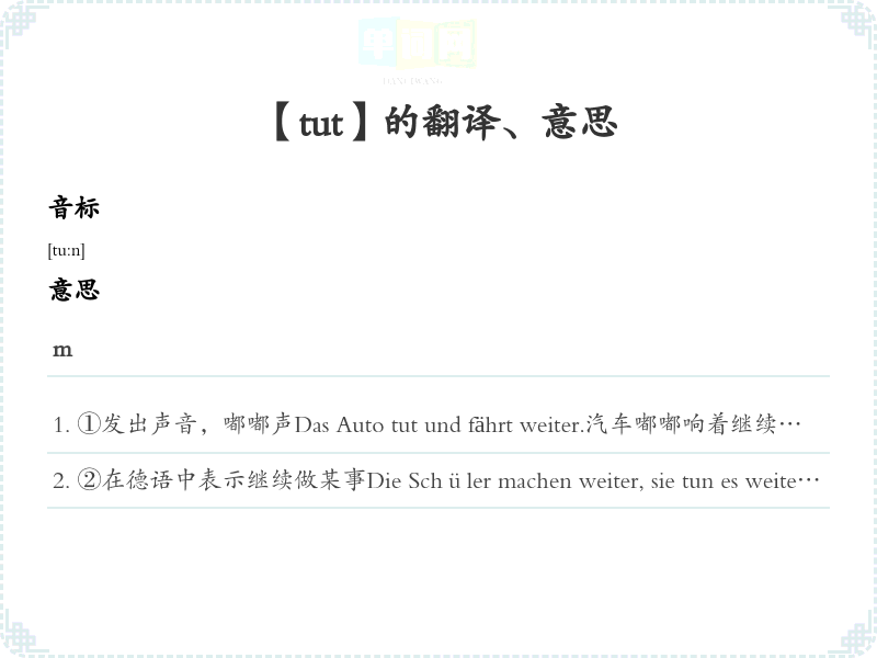 ①发出声音,嘟嘟声Das Auto tut und fährt weiter.汽车嘟嘟响着继续前行。