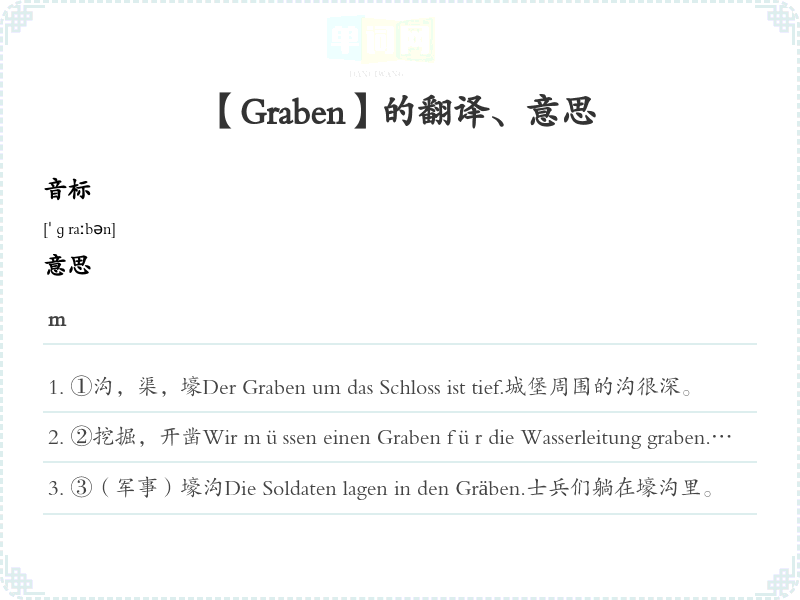②挖掘,开凿Wir müssen einen Graben für die Wasserleitung graben.我们必须为水管挖一个沟。
