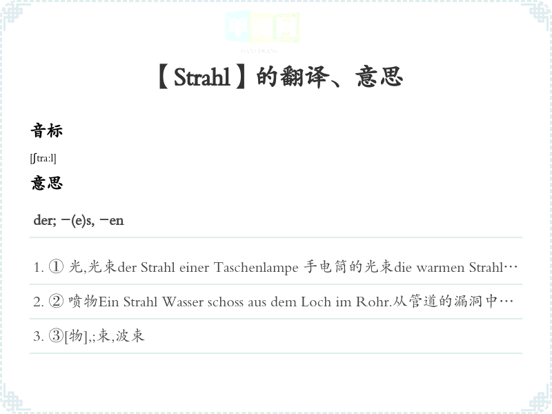 ① 光,光束der Strahl einer Taschenlampe 手电筒的光束die warmen Strahlen der Sonne太阳温暖的光束