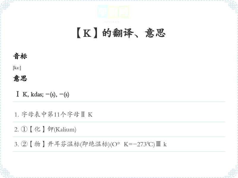 ②【物】开耳芬温标(即绝温标)(O°K=-273℃)Ⅲ k