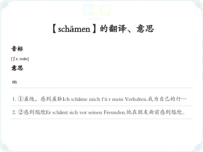①羞愧,感到羞耻Ich schäme mich für mein Verhalten.我为自己的行为感到羞愧。