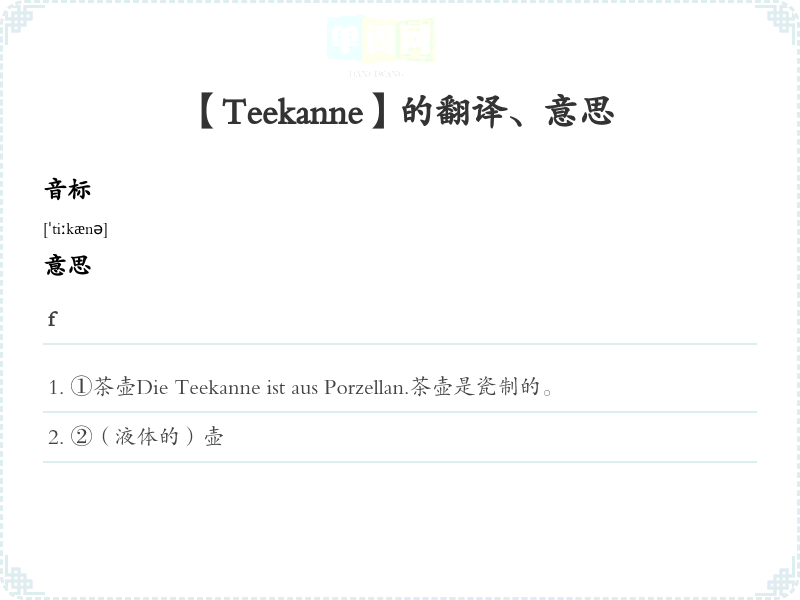 ①茶壶Die Teekanne ist aus Porzellan.茶壶是瓷制的。