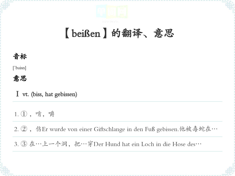 ① ,叮(某人)von Schnaken gebissen wurden被大蚊子了Ein Floh hat ihn gebissen.跳蚤了他。Der Hund hat ihn/ihm ins Bein gebissen.狗了他腿。