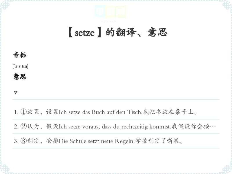 ①放置,设置Ich setze das Buch auf den Tisch.我把书放在桌子上。