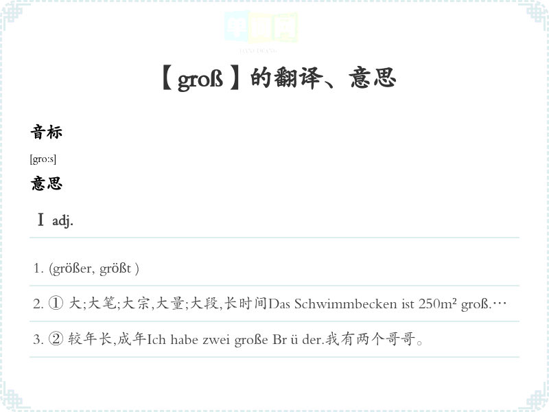 ① 大;大笔;大宗,大量;大段,长时间Das Schwimmbecken ist 250m² groß.泳池有250平米大。Mein Bruder ist einen Meter achtzig groß.我兄弟身高米八。Der große Zeiger der Uhr zeigt die Minuten an, der kleine die Stunden.长针指示钟,短针指示小时。Der Elefant ist ein großes Tier.大象是种很大动物。