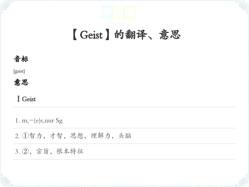 ③一个…的人ein +Adj.+GeistRousseau ist einer der größten Geister seiner Zeit.卢梭他那个时代最伟大的思想家之一。ein großer Geist杰出的人der Heilige Geist圣灵[谚] Daran/Hier scheiden sich die Geister.[谚]仁者见仁,智者见智[口]Du bist wohl von allen guten Geistern verlassen![口]你简直太不懂事/胡思乱想了!
