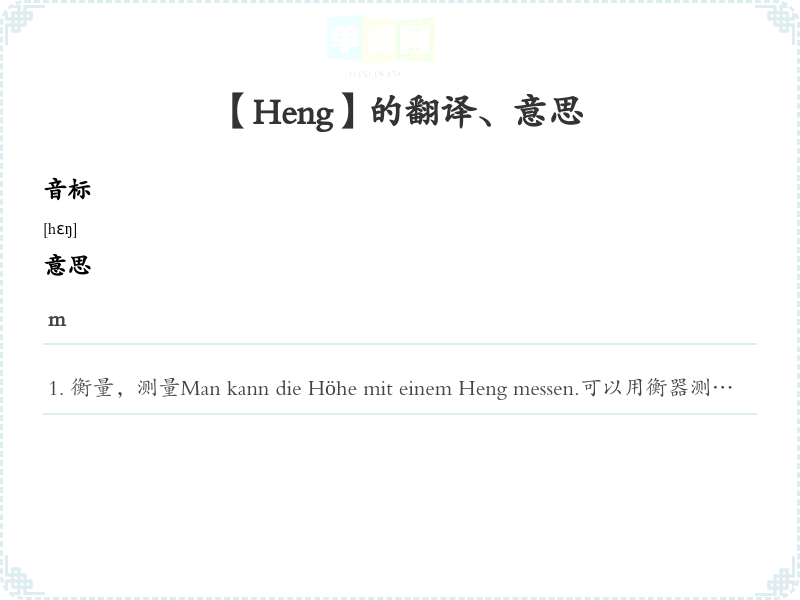 衡量,测量Man kann die Höhe mit einem Heng messen.可以用衡器测量高度。衡器,称量器具Der Heng wird zur Gewichtsmessung verwendet.衡器用于重量测量。标准,基准Der Heng dient als Maßstab für die Qualität.衡作为质量的标准。