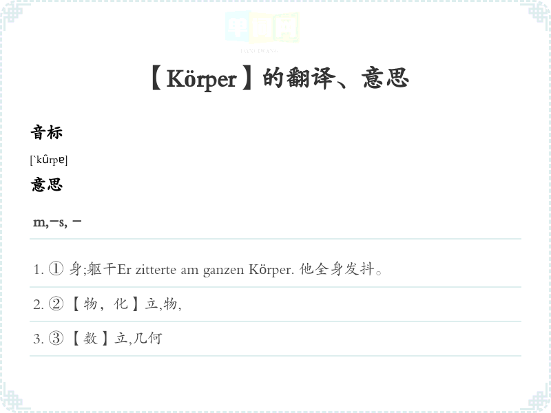 ⑤ <专业用词>度,密度专业用词>Der Wein hat Körper. 这葡萄酒味。
