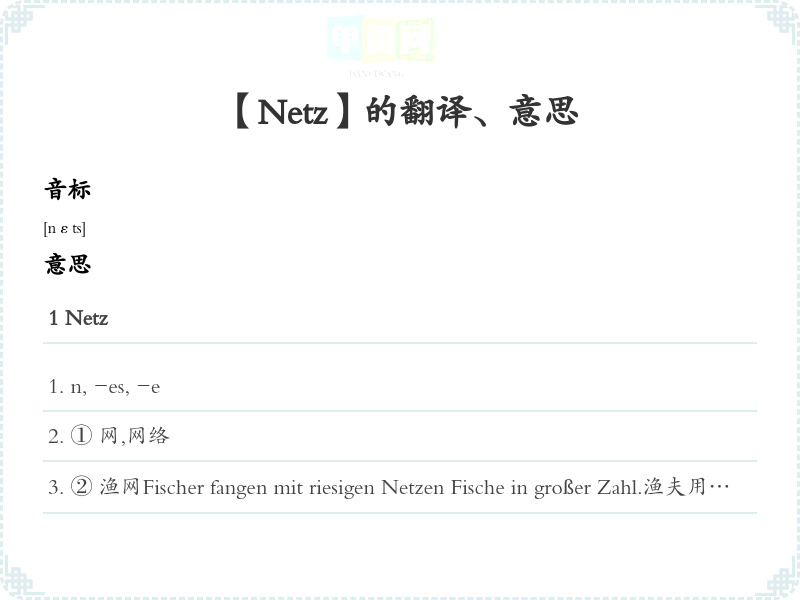 ① (交通)系统,网络Deutschland hat ein gut ausgebautes Netz von Autobahnen.德国有四通八达的网络系统。In Deutschland bilden Autobahnen ein Netz, das nicht nur Großstädte verbindet.在德国,高速公路形成了一个不仅是连接到大城市的交通系统。