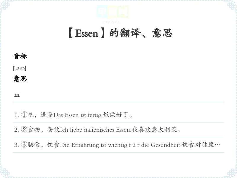 ①吃,进餐Das Essen ist fertig.饭做好了。