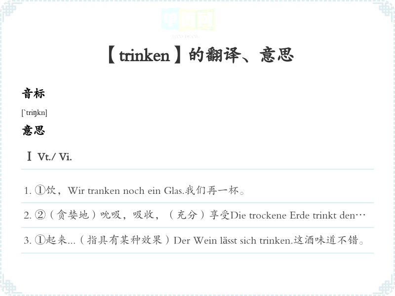 ②(贪婪地)吮吸,吸收,(充分)享受Die trockene Erde trinkt den Regen.干旱的大地吮吸着雨水。Ⅱ Vi.酗酒Er hat angefangen zu trinken.他已经开始酗酒。Ihr Mann trinkt.她丈夫是个酒鬼。Ⅲ refl.